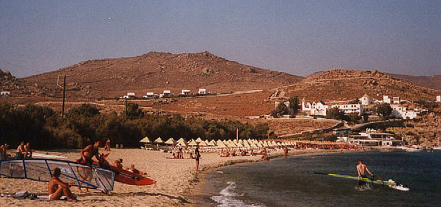 La plage est équipée de parasols et il y a un self-service avec une terrasse ombragée très pratique pour observer la faune locale. Assez stéréotypée d'ailleurs : jolies filles et beaux gosses tout droit sortis des magazines. Il y a beaucoup de gays (Mykonos est connu pour cela), mais ils ne sont pas majoritaires, même si on peut en avoir l'impression car les hommes sont lookés gay (exemple : barbiche et bandanna). Au moment où nous partons, les gens commencent à danser près de la piscine.