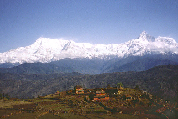 Le ciel s'est dégagé, et nous apercevons pour la première fois l'Himalaya qui émerge derrière les arbres. Le sommet le plus proche est le Machapuchare (6997 m) et à sa gauche l'Annapurna (8091 m). Le nom Machapuchare vient de la forme du sommet, qui rappelle une queue de poisson.